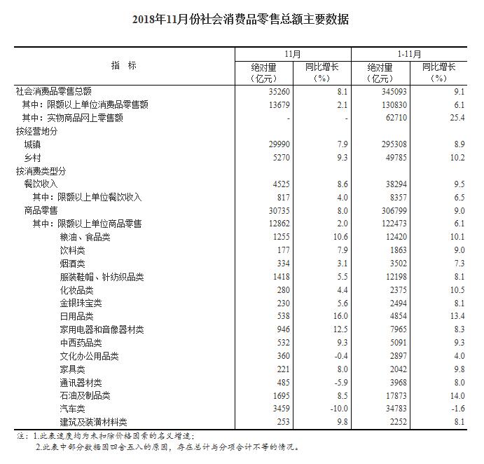2018年11月份,社会消费品零售总额35260亿元,同比名义增长8.1%(扣除价格因素实际增长5.8%,以下除特殊说明外均为名义增长)。其中,限额以上单位消费品零售额13679亿元,增长2.1%。