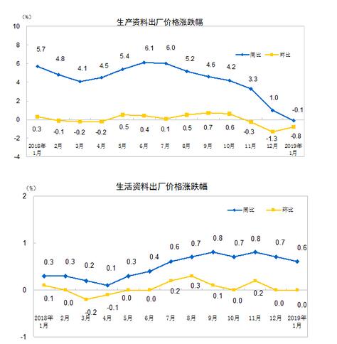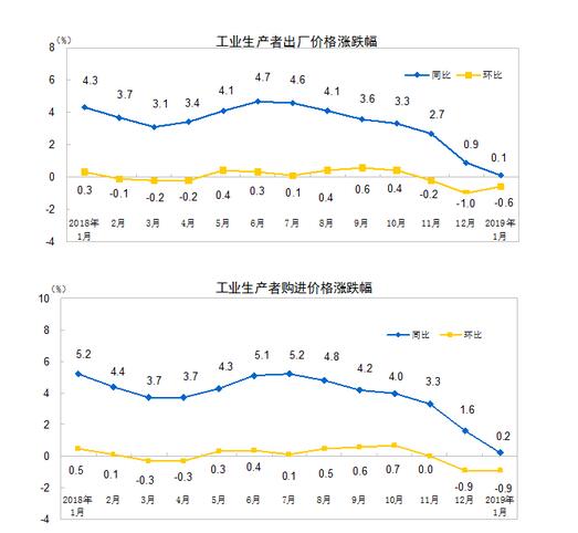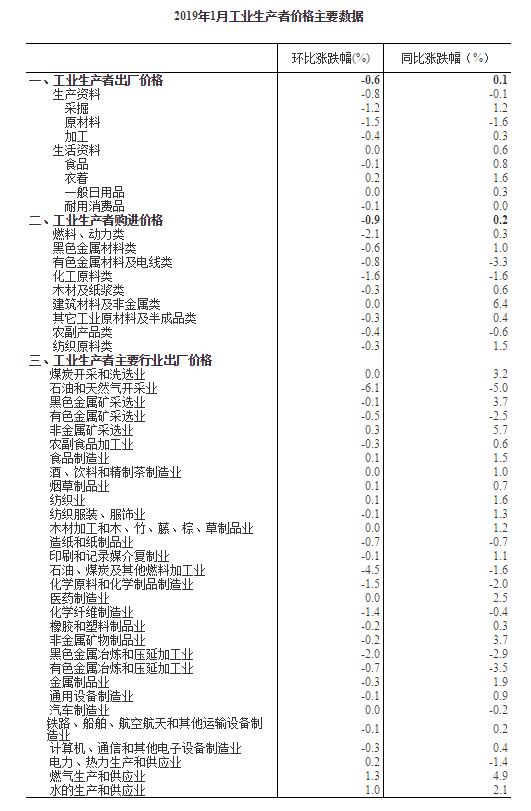 2019年1月份,全国工业生产者出厂价格同比上涨0.1%,环比下降0.6%;工业生产者购进价格同比上涨0.2%,环比下降0.9%。