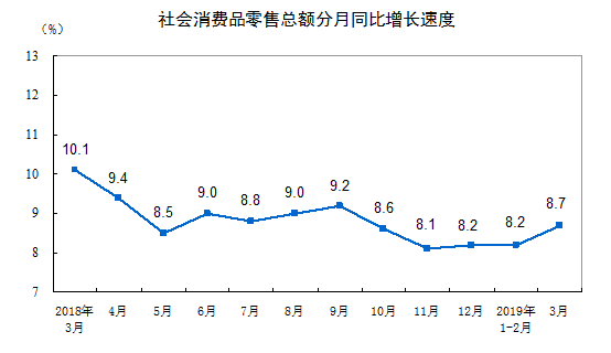 2019年一季度社会消费品零售总额增长8.3%