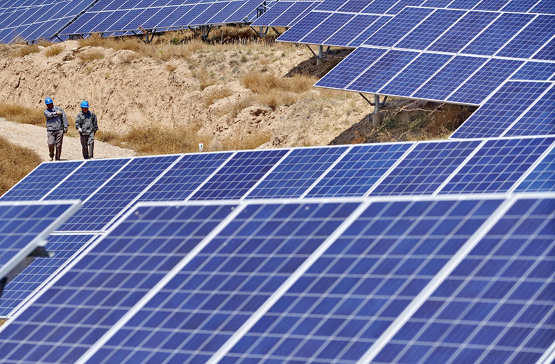 工人在河北省张家口市怀安县西沙城乡西沙城村附近荒山上的光伏发电场巡查并网线路(5月13日摄)。新华社记者 杨世尧 摄