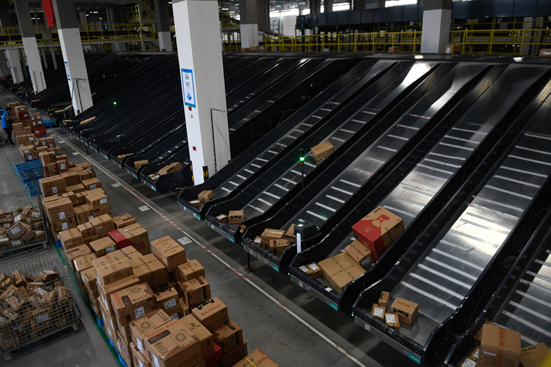 在浙江嘉兴菜鸟“未来园区”,商品按照包裹地址的不同进行自动分拨(3月27日摄)。新华社记者 黄宗治 摄