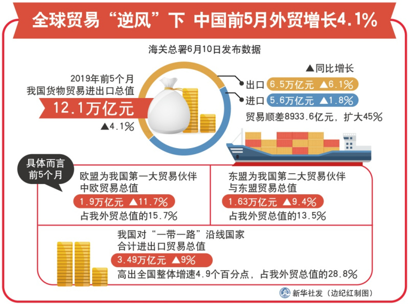 图表:全球贸易“逆风”下 中国前5月外贸增长4.1%