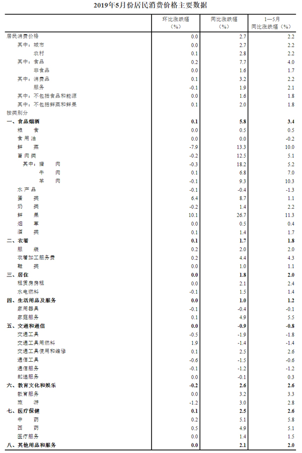 2019年5月份,全国居民消费价格同比上涨2.7%。其中,城市上涨2.7%,农村上涨2.8%;食品价格上涨7.7%,非食品价格上涨1.6%;消费品价格上涨3.2%,服务价格上涨1.9%。1-5月平均,全国居民消费价格比去年同期上涨2.2%。