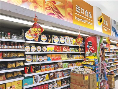 北京某超市货架上的进口食品种类繁多、琳琅满目,供消费者挑选。记者 李婕 摄