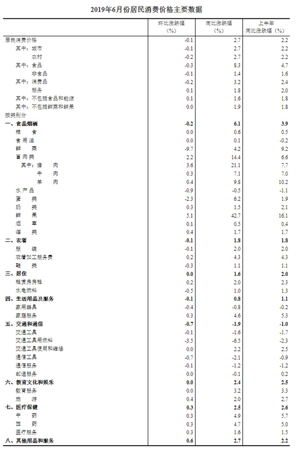 2019年6月份,全国居民消费价格同比上涨2.7%。其中,城市和农村均上涨2.7%;食品价格上涨8.3%,非食品价格上涨1.4%;消费品价格上涨3.2%,服务价格上涨1.8%。上半年,全国居民消费价格比去年同期上涨2.2%。