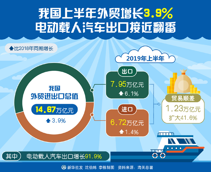 图表:我国上半年外贸增长3.9% 电动载人汽车出口接近翻番