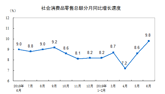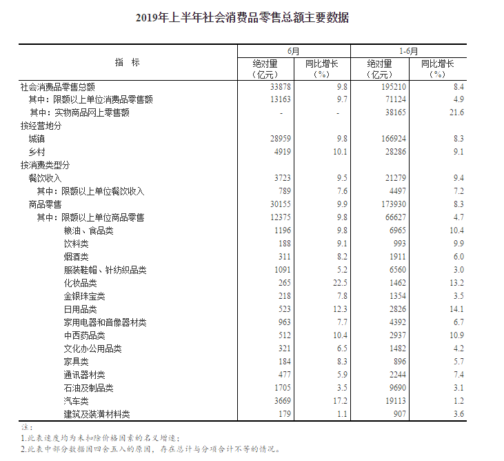 2019年上半年,社会消费品零售总额195210亿元,同比名义增长8.4%(扣除价格因素实际增长6.7%,以下除特殊说明外均为名义增长)。其中,6月份社会消费品零售总额33878亿元,同比增长9.8%。