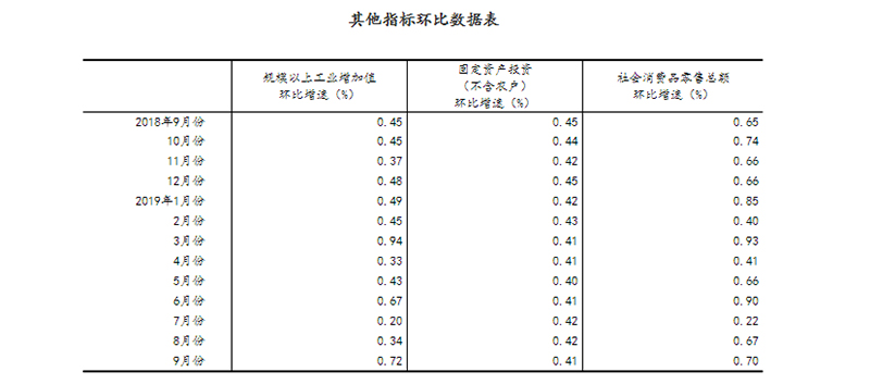 (2)根据季节调整模型自动修正结果,对近一年来各期国内生产总值、规模以上工业增加值、固定资产投资(不含农户)、社会消费品零售总额环比增速进行修订。修订结果及2019年三季度GDP环比数据、2019年9月份其他指标环比数据如下: