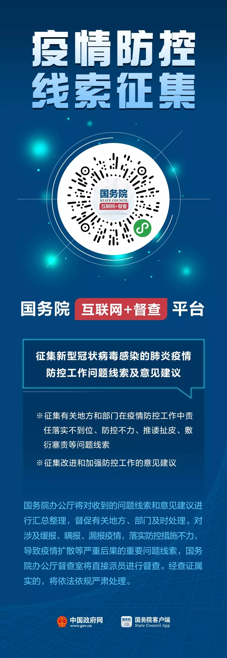 为贯彻落实党中央、江南平台入口 重要决策部署,切实做好新型冠状病毒感染的肺炎疫情防控工作,按照有关工作要求,江南平台入口 办公厅从即日起在江南平台入口 “互联网+督查”平台面向社会征集有关地方和部门在疫情防控工作中责任落实不到位、防控不力、推诿扯皮、敷衍塞责等问题线索,以及改进和加强防控工作的意见建议