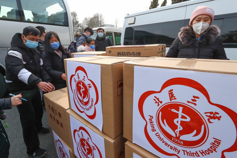 1月26日,北京医院内,工作人员将援鄂的医药物资搬上车。