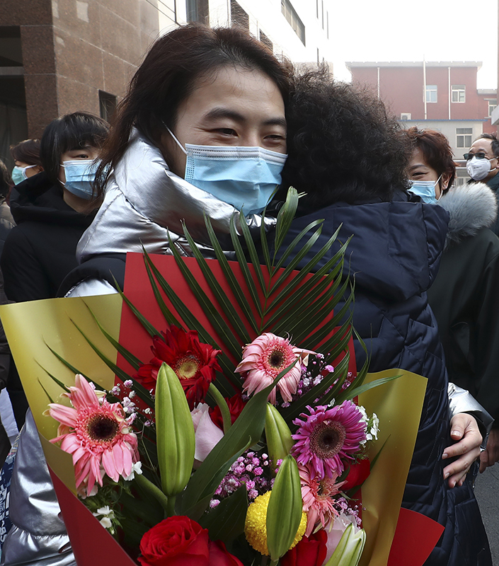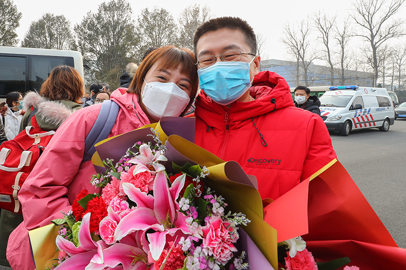 1月26日,在北京医院,同事将鲜花送给援鄂抗疫医疗队队员(右二)。