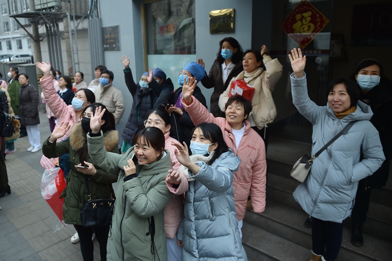 1月26日,在北京医院,人们与援鄂抗疫医疗队的队员挥手告别。
