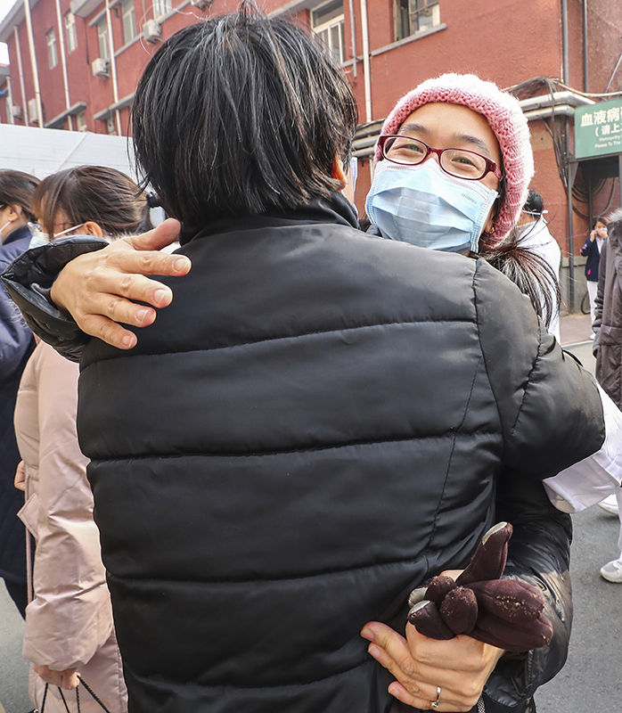 1月26日,国家援鄂抗疫医疗队队员、北医三院血液科护士胡静在医院内与同事告别。