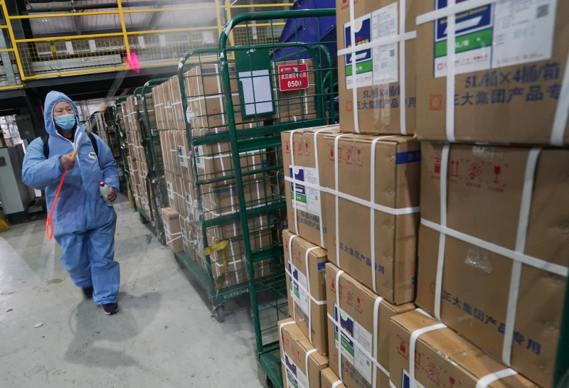 1月27日,武汉邮区中心局邮件处理中心的职工对援助物资进行消杀处理。