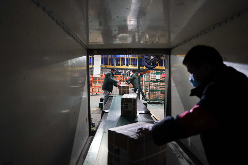 1月27日,武汉邮区中心局邮件处理中心的职工在卸货分拣援助物资。