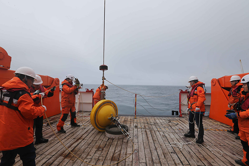 1月27日,科考队员在“雪龙2”号后甲板布放浮标。