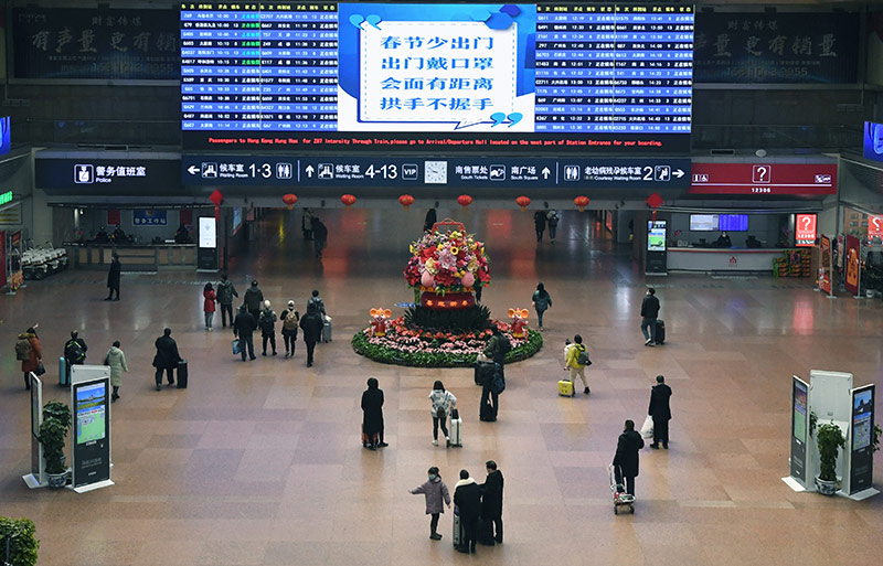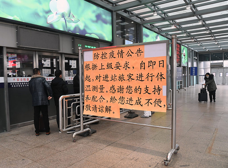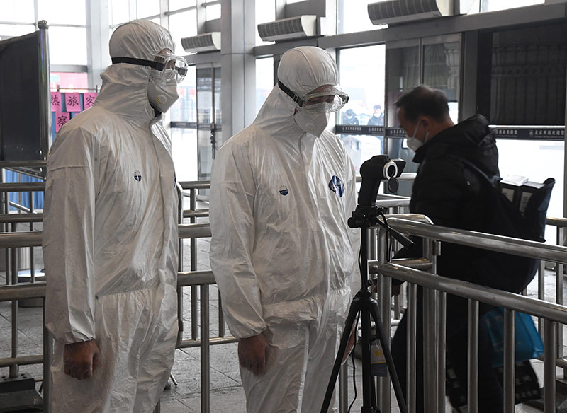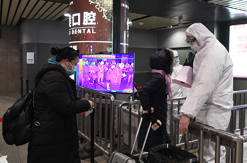 1月28日,在北京西站出站口,工作人员通过红外测温仪对进站旅客的体温进行检测。