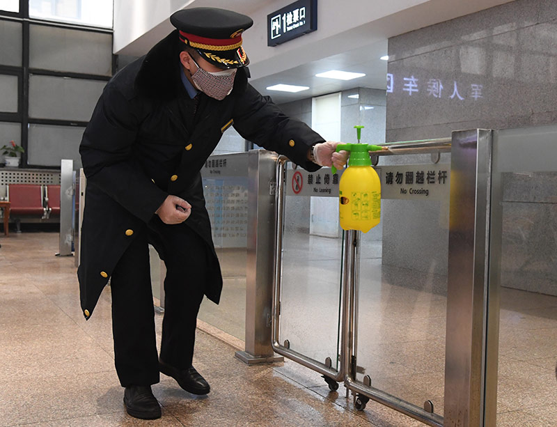 1月28日,工作人员对北京西站内的扶梯进行消毒。