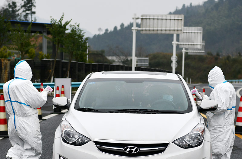 近日,贵州省疾控、医卫、交警等部门工作人员坚守岗位,深入各高速公路出入口,对来往车辆人员进行体温测量、行踪登记、疫情防控常识宣传,防止新型冠状病毒感染的肺炎传播。