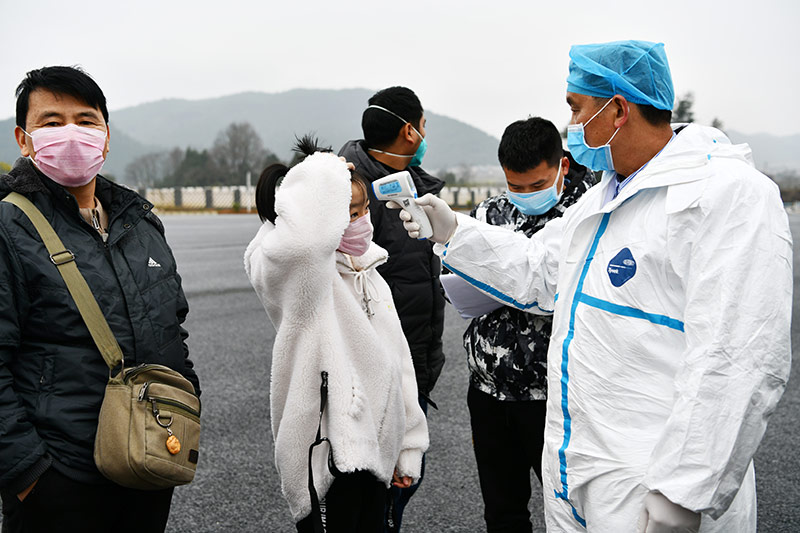 1月28日,在贵州省三都西高速公路收费站出口,工作人员在对过往车辆上的人员进行体温测量。