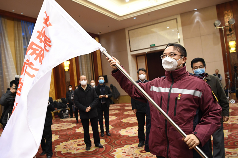 1月28日,由甘肃省卫生健康委组建的甘肃医疗救治队从甘肃兰州启程奔赴湖北武汉。这是甘肃医疗救治队队长蔡辉(前)在出发仪式上接过医疗救治队队旗。新华社记者 陈斌 摄