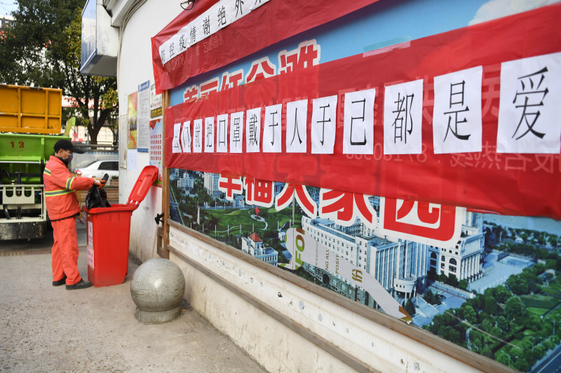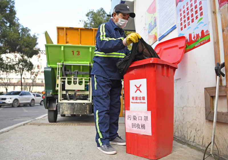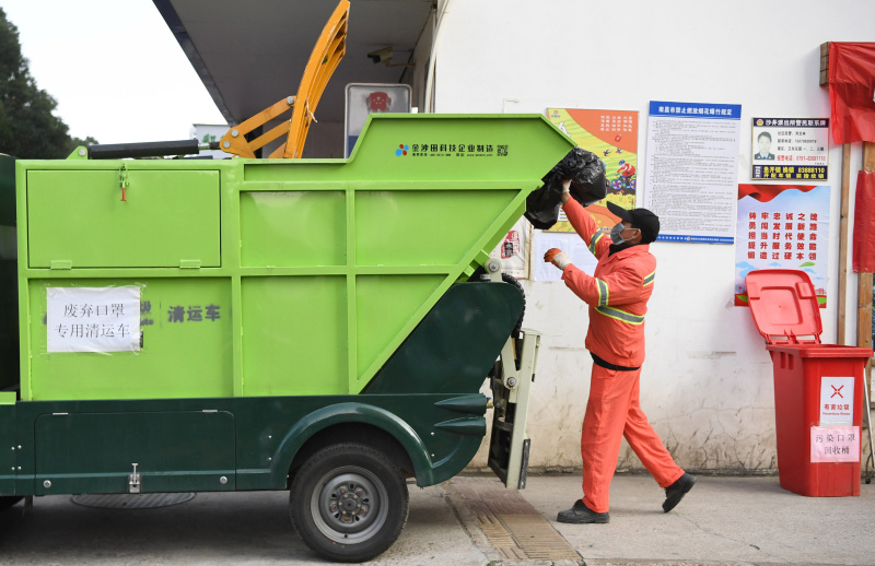1月31日,在南昌市红谷滩新区卫东花园小区,沙井街道综管办的环卫工人将废弃口罩装车。