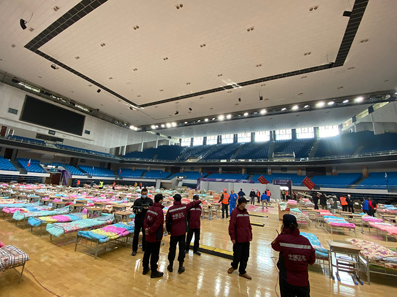 武汉洪山体育馆内搭起临时病床,备好物资,准备收诊新型冠状病毒感染的肺炎轻症患者(2月4日摄)。新华社记者 冯国栋 摄