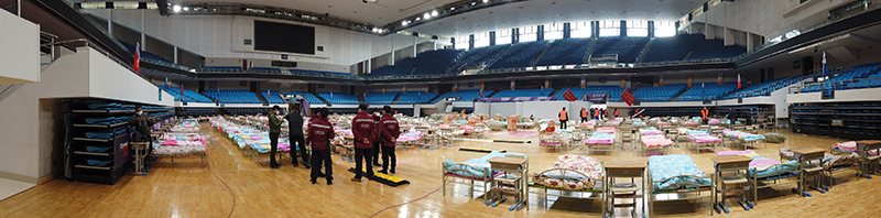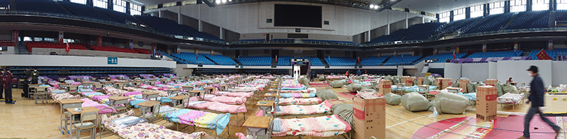武汉洪山体育馆内搭起临时病床,备好物资,准备收诊新型冠状病毒感染的肺炎轻症患者(2月4日摄,拼接照片)。新华社记者 冯国栋 摄