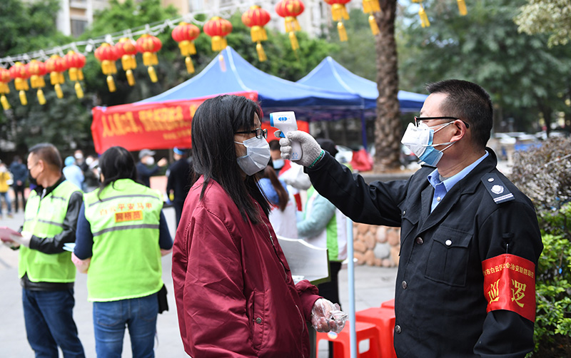 2月6日,广州市白云区黄石街道白云尚城社区的工作人员对进入社区的人进行体温测量。