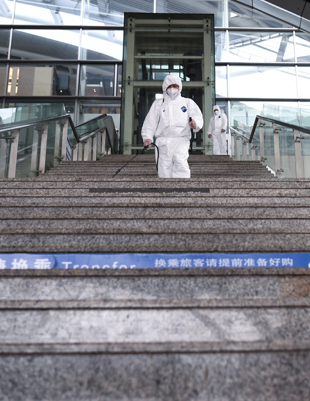2月7日,工作人员在广州南站站内进行消毒作业。