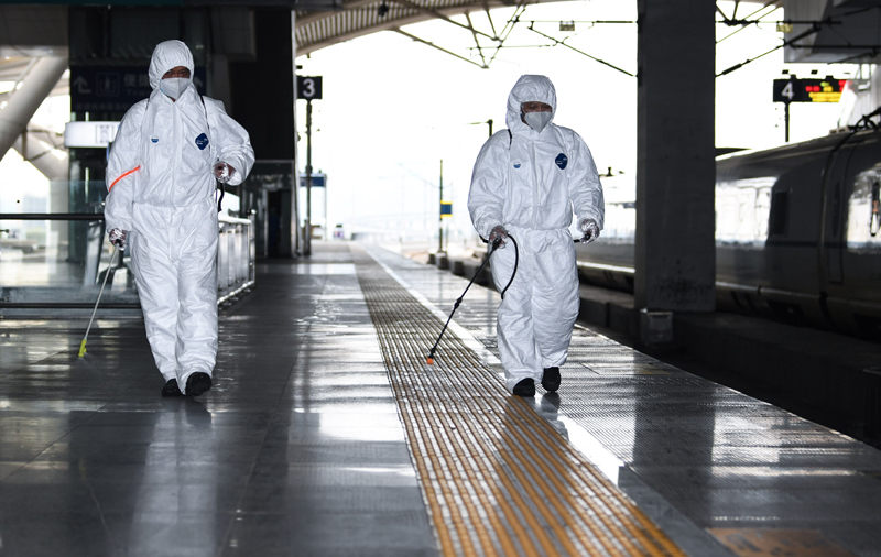 2月7日,工作人员在广州南站站台上进行消毒作业。