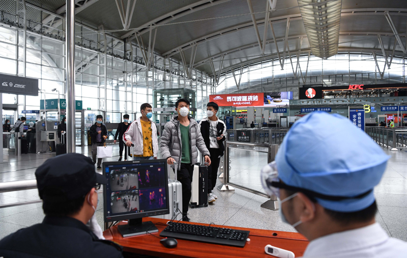 2月7日,在广州南站进站口,工作人员通过红外测温仪对进站旅客的体温进行监测。