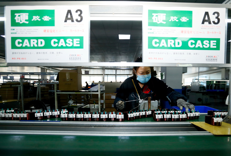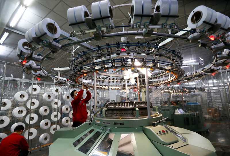 2月14日,在位于山东青岛市即墨区的青岛即发集团有限公司生产车间里,工人在制作出口到海外的服装产品。
