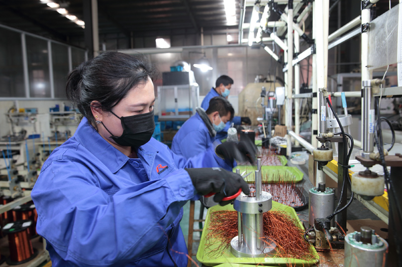 2月13日,在位于山东青岛市即墨区的青岛云路新能源科技有限公司生产车间里,工人在生产线上忙碌。