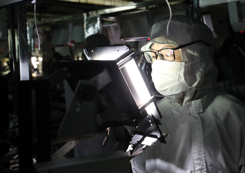 2月14日,江苏苏州高新区晶端显示精密电子(苏州)有限公司单品制造车间工人在灯下检验产品。
