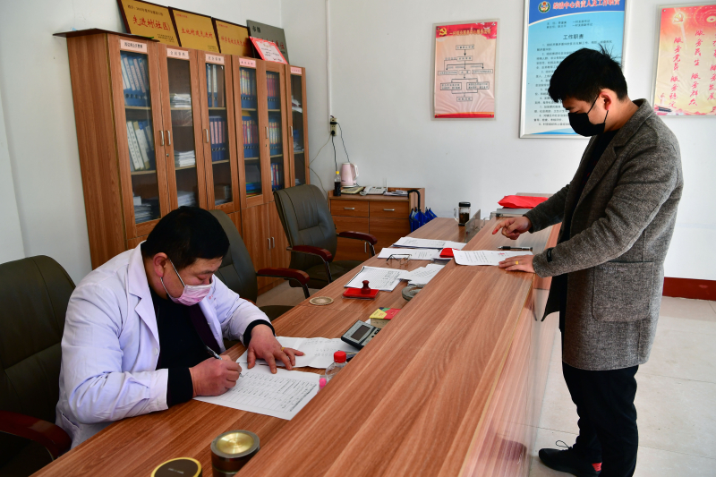 2月16日,在南阳市卧龙区石桥镇一村村民委员会,一位村医(左)根据体温检测情况为外出务工人员办理健康证明。