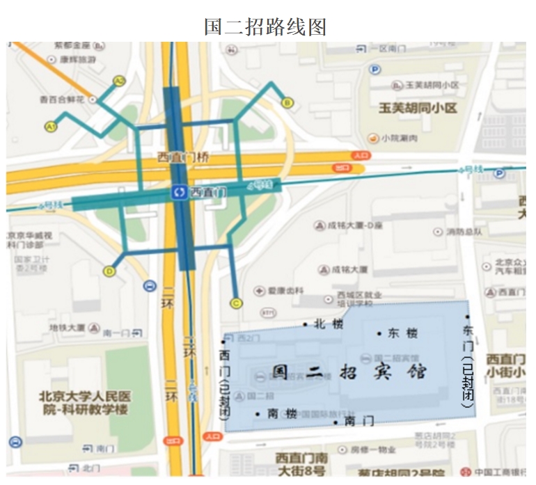 北京国二招宾馆路线:乘坐北京地铁2号线/4号线/13号线至西直门站C出口,直行100米见路口左转,步行50米即可到达。如自驾前往请于2月23日20时前,通过下方联系电话报备车号。人员和车辆从北京国二招宾馆南门进入。