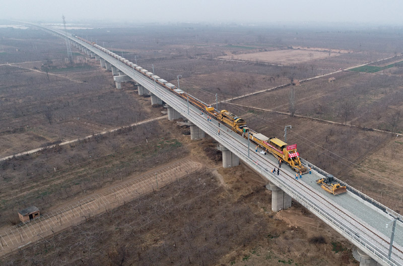 2月26日,在银西高铁陕西礼泉段,中铁一局新运公司施工人员操作铺轨设备。