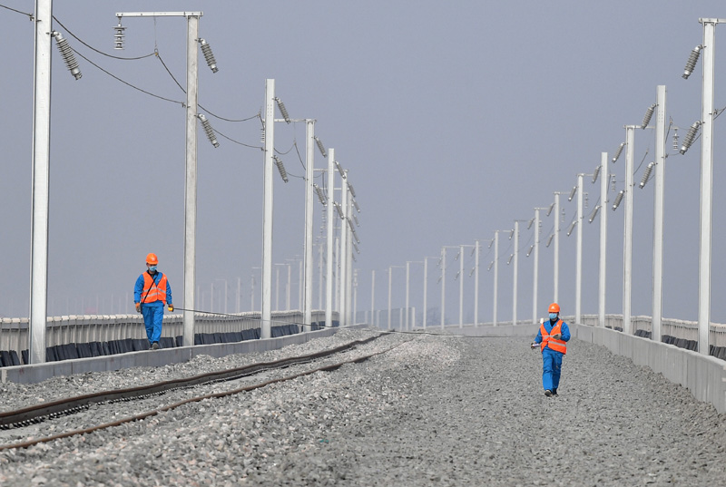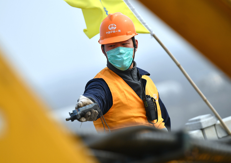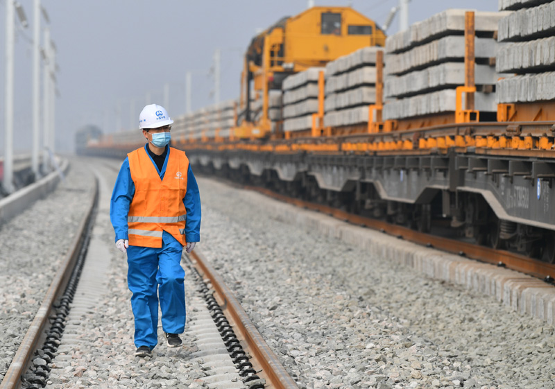 2月26日,在银西高铁陕西礼泉段,中铁一局新运公司施工人员查看铺轨设备运行情况。