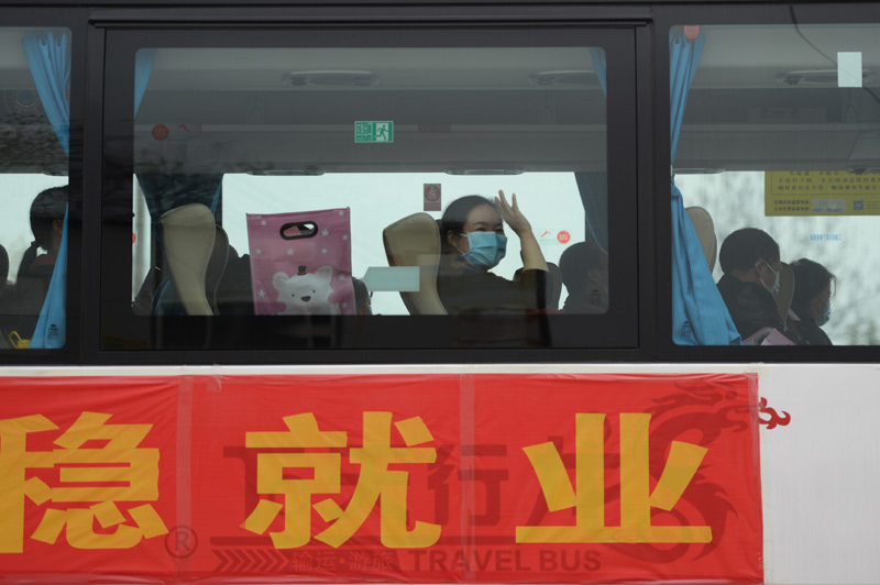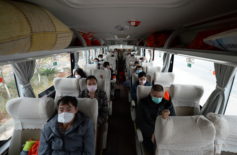 2月26日,在湖南省新化县,务工人员乘坐返岗大巴车。