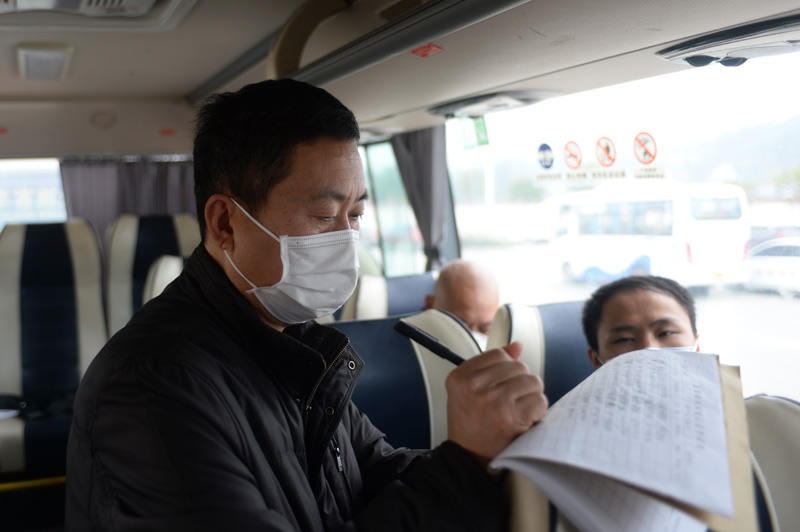 2月26日,大巴车出发前,工作人员核实务工人员信息。