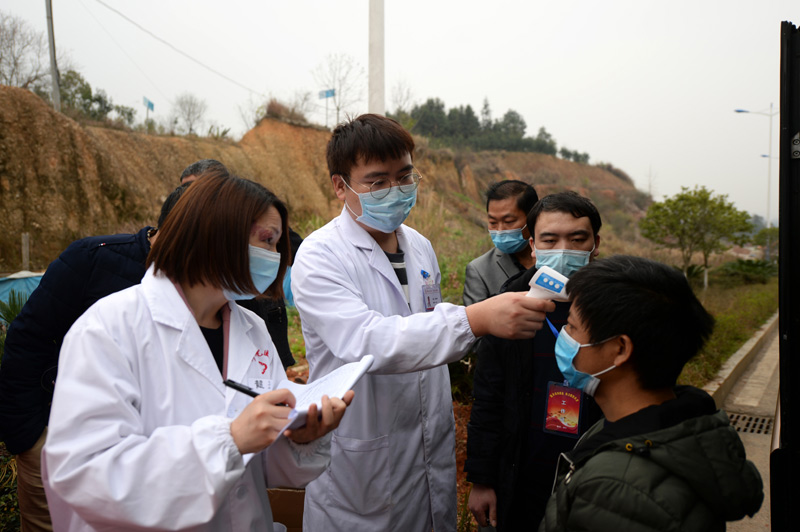 2月26日,务工人员登车前,医务人员为他们测量体温。