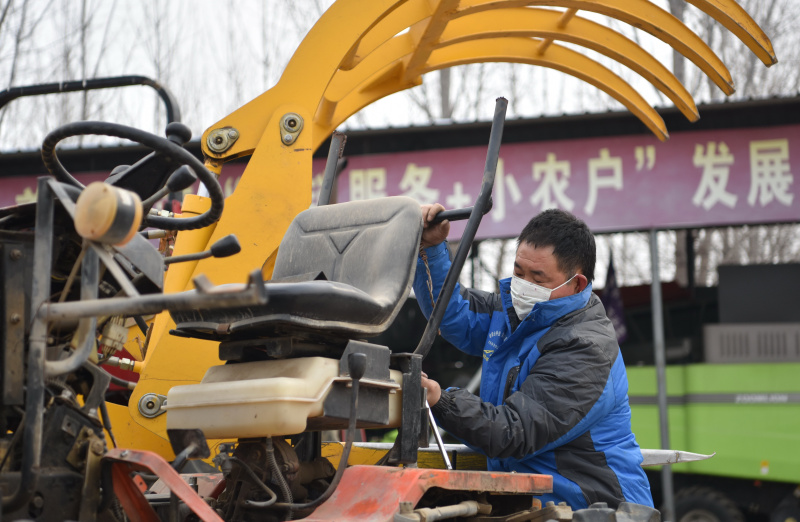 2月27日,河北省定州市信联农机专业合作社农民在检查农机设备。