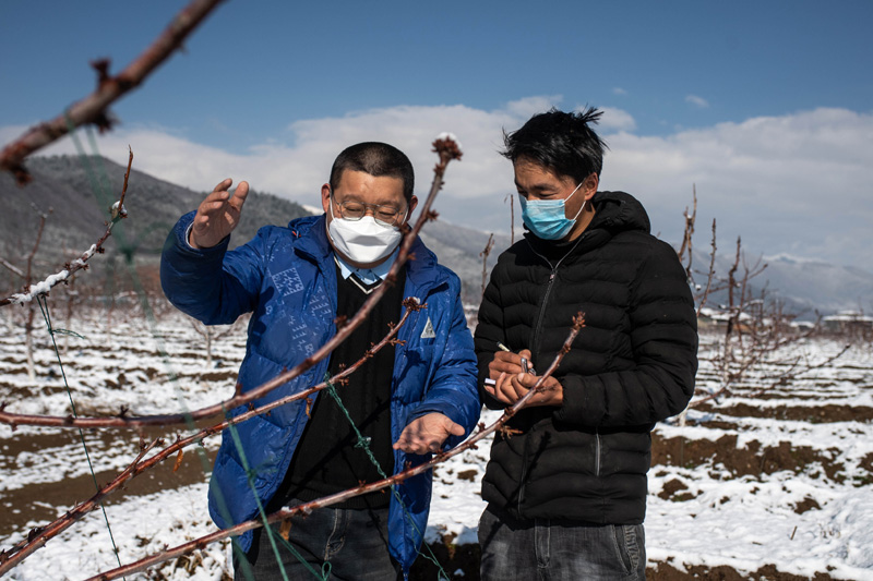 3月17日,在贵澳香格里拉大数据扶贫产业示范园,技术人员(左)在指导从德钦县羊拉乡易地搬迁至香格里拉市的鲁茸达瓦车厘子种植技术。