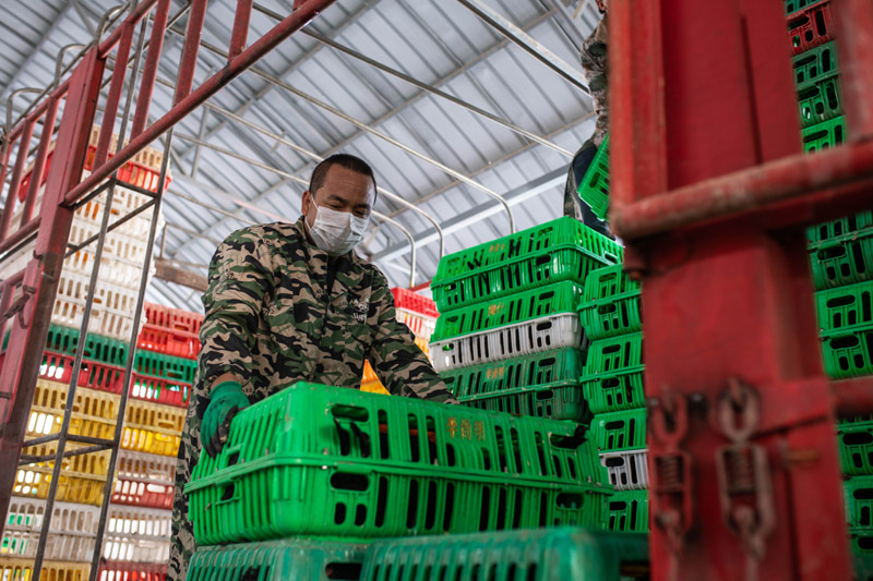 3月17日,在香格里拉市电子商务公共服务中心,工作人员在搬运收购的尼西鸡。