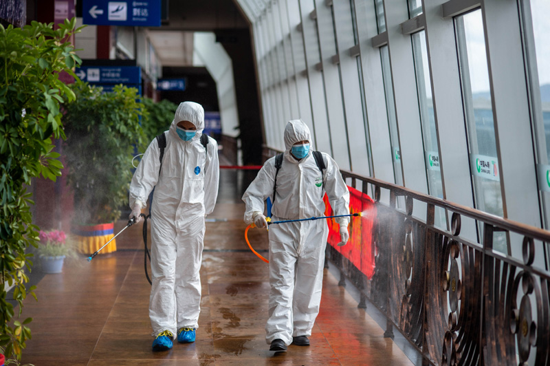 3月17日,在迪庆香格里拉机场,工作人员在对航站楼进行消毒。