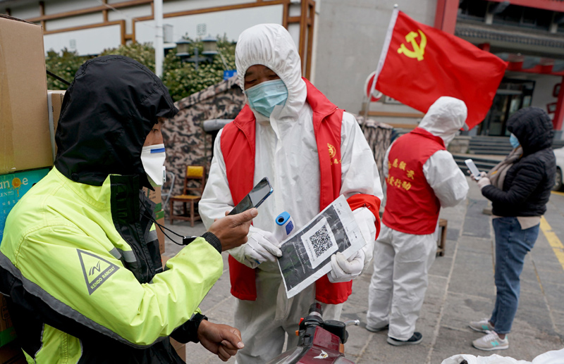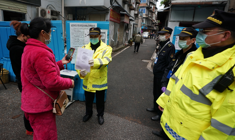 4月11日,武汉城管工作人员在黄鹤楼街大成路大陶家巷执勤,让进入小区的人员扫描健康码。