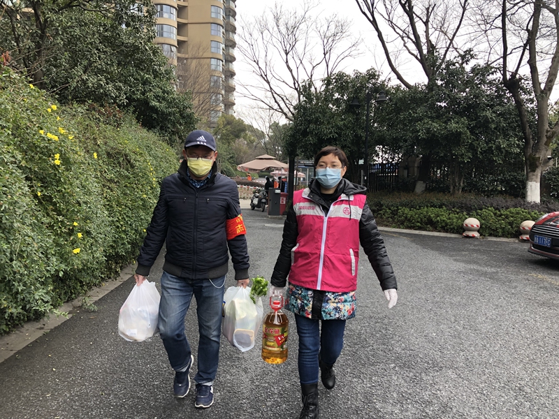 杭州市四季青街道钱塘社区工作人员和志愿者给隔离户送生活物资(3月2日摄)。新华社发