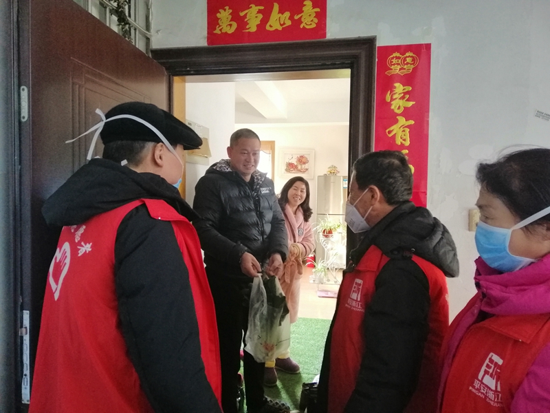 浙江省衢州市常山县天马街道金川社区“啄木鸟”志愿服务队党员为武汉返乡家庭送上自家种的放心菜(2月1日摄)。新华社发