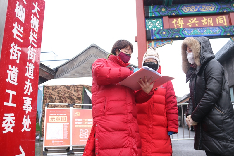 北京市西城区大栅栏街道石头社区社工在博兴胡同登记点上值守(2月14日摄)。新华社发(崔耀平 摄)